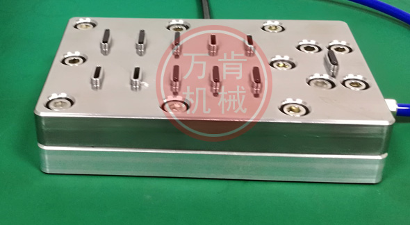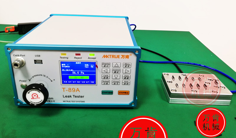 1. 萬(wàn)肯機(jī)械使用了負(fù)壓泄漏測(cè)試儀與簡(jiǎn)易治具為一體的檢漏系統(tǒng),操作更加方便快捷。檢測(cè)前,儀器里設(shè)置好相應(yīng)的測(cè)試參數(shù),測(cè)試時(shí),將手機(jī)卡托全部裝入治具載體,按下儀器啟動(dòng)鍵,儀器將治具內(nèi)部氣體往外抽出,模擬IP67防水測(cè)試過(guò)程,達(dá)到穩(wěn)定后,儀器會(huì)通過(guò)治具內(nèi)部的壓力變化進(jìn)行手機(jī)卡托的氣密性檢測(cè),并顯示壓漏參數(shù)及判斷結(jié)果。